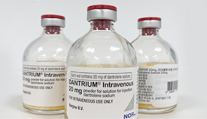 Dantrolene is a treatment for ‘malignant hypothermia,’ when the body temperature rapidly rises following general anesthesia; we have it available for such 0.1% of emergency situations.