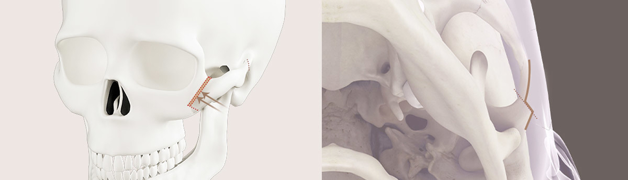 Depending on the bone width, a planned amount of the body of the zygomatic bone is cut and removed in an L-shape. The bone is set back to make a natural curve from the excessively protruding bone. To prevent sagging and increase contact between the bone surfaces, the bone is rotated and fixed securely with pins.