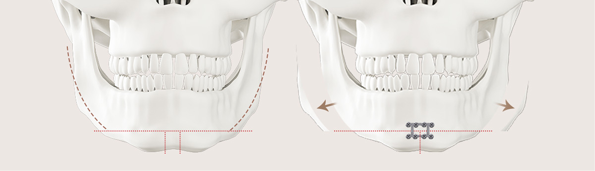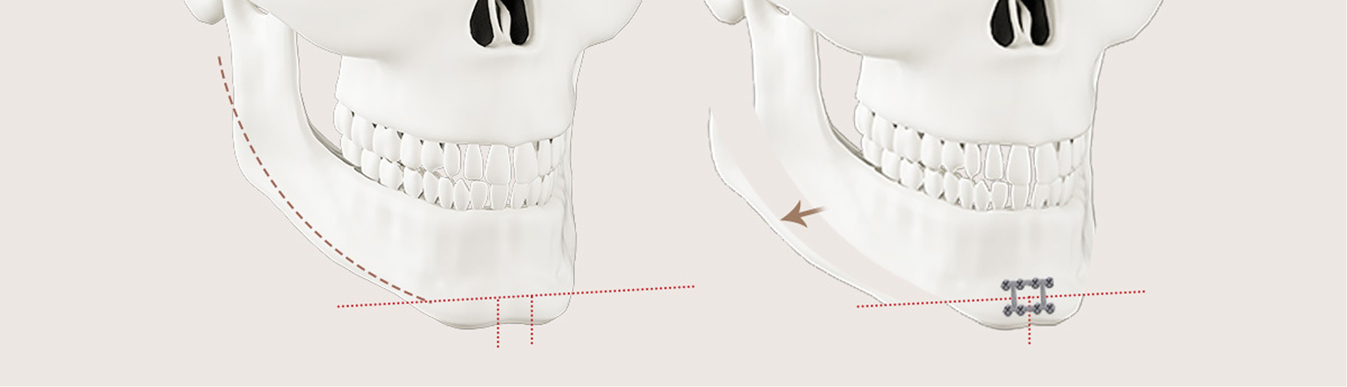 The width of the tip of the chin is narrowed as desired, and the length of the chin is reduced or extended to achieve an ideal facial proportion. A protruding chin or short chin can also be moved forward or backward to form a natural side profile. As a result, the overall shape, proportions, and image of the face are achieved.